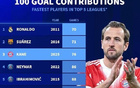 • 本世纪五大联赛参与百球最快TOP10:C罗70场第1,苏牙71场第2